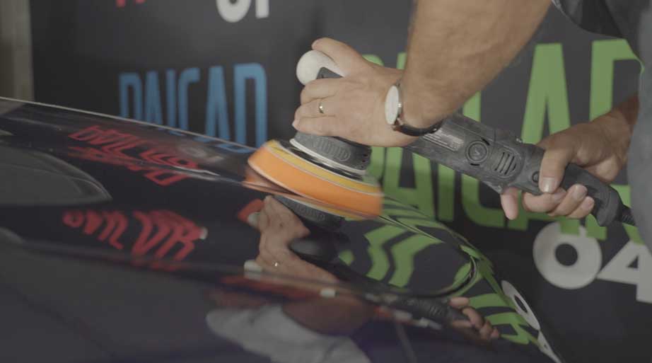 Applicare una piccola quantità di PAICAR 02 – Pasta lucidante Medium Cut direttamente sul tampone medio-rigido arancione DA-02 e utilizzare il tampone per stendere il prodotto sulla superficie. Selezionare una lucidatrice rotorbitale e iniziare a bassi giri, quindi aumentarli gradualmente, lucidando con movimenti incrociati, ossia da destra a sinistra e dall’alto in basso. Ripulire la superficie con un panno in microfibra Silky Tech, in modo da rimuovere ogni eventuale residuo. Seguire la stessa procedura nel caso venisse utilizzata la cuffia in lana SL3, selezionando una lucidatrice rotativa: iniziare a bassi giri (800 RPM) e aumentarli progressivamente fino a 2000 RPM.